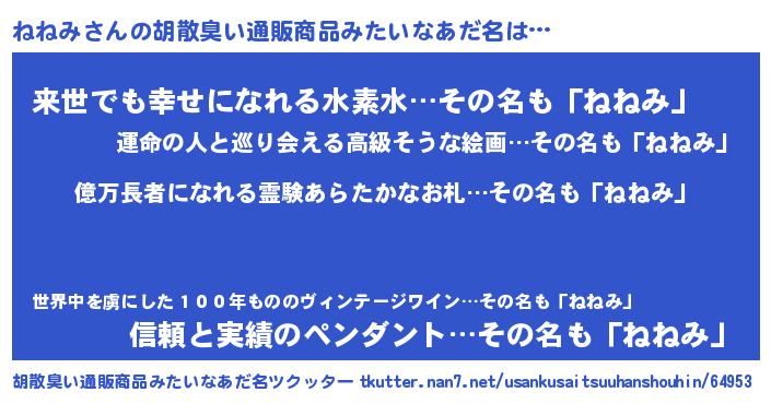 | 肩書あだ名 | 『ねねみ上級大将』『ねねみ御曹司』 |