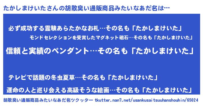 | 男性向けラノベタイトル風あだ名 | 『タカシマケイタスレイヤー』 |