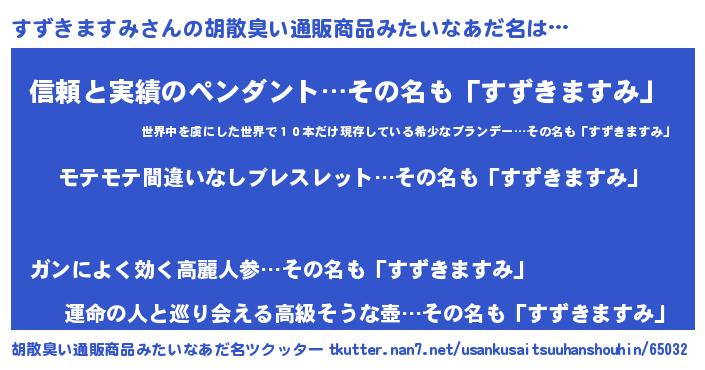 | 男性向けラノベタイトル風あだ名 | 『すずきますみに滅ぼされるだけの簡単なお仕事です』 |