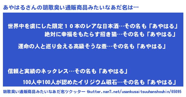 | ヘコむあだ名 | 『酢こんぶ』『あやはる(爆)』 |