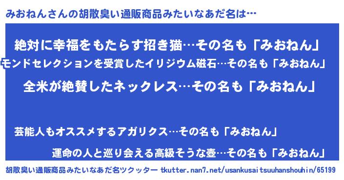 | 女子向けラノベタイトル風あだ名 | 『みおねん様がみてる』『みおねん恋絵巻』 |