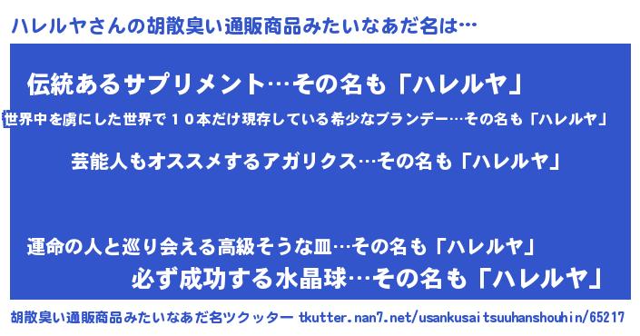 | 男性向けラノベタイトル風あだ名 | 『Re:ハレルヤから始める異世界生活』 |