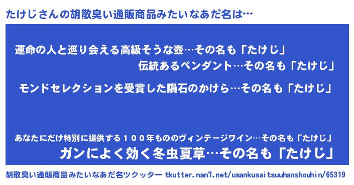 | 意味不明あだ名 | 『眠気覚ましガムたけじ味』『自称たけじ』 |