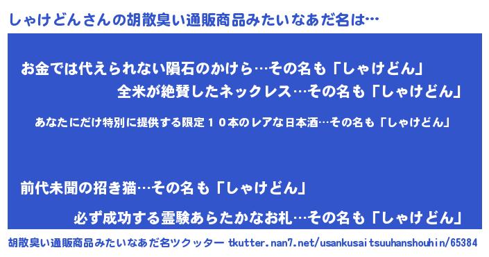 | 意味不明あだ名 | 『住所不定無職しゃけどん(53歳)』 |
