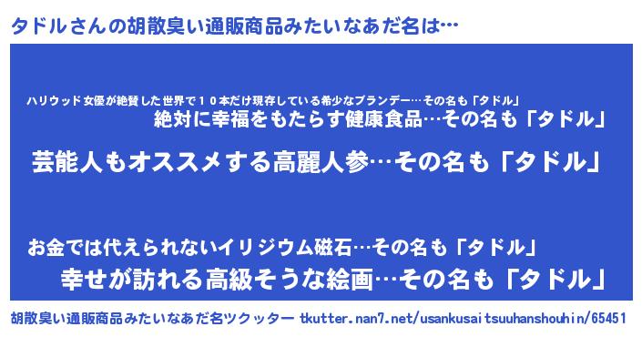 | 意味不明あだ名 | 『自称タドル』『住所不定無職タドル(98歳)』 |