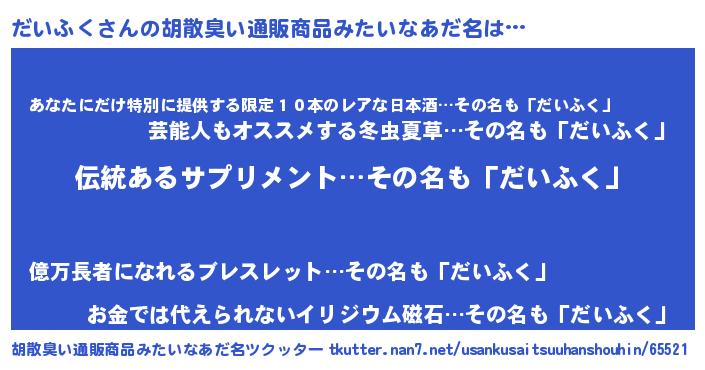 | 男性向けラノベタイトル風あだ名 | 『ダンジョンにだいふくを求めるのは間違っているだろうか』 |
