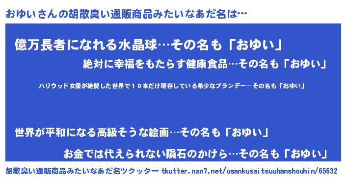 | 男性向けラノベタイトル風あだ名 | 『魔弾の王とおゆい』『おゆいの憂鬱』 |