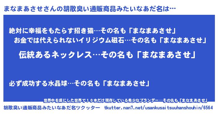 | 男性向けラノベタイトル風あだ名 | 『転生したらまなまあさせだった件』 |