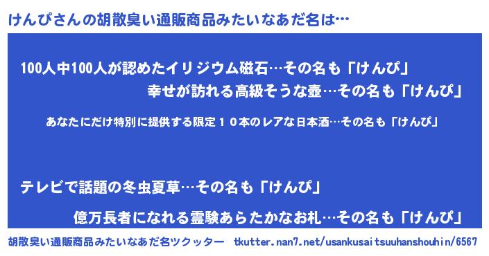 | 意味不明あだ名 | 『住所不定無職けんぴ(68歳)』『自称けんぴ』 |