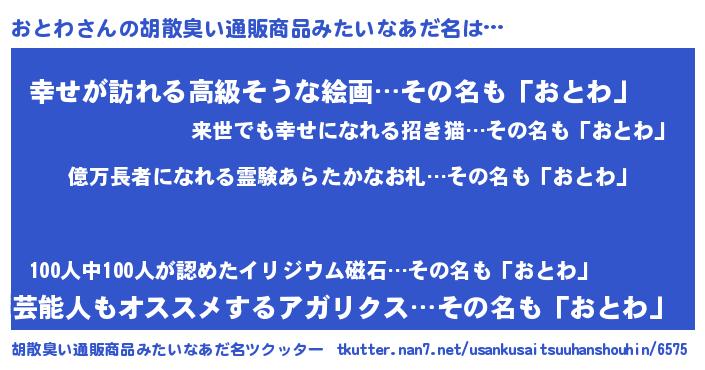 | 男性向けラノベタイトル風あだ名 | 『オトワアートオンライン』 |