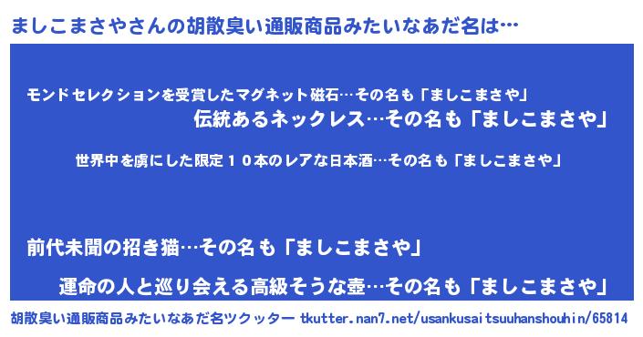 | 意味不明あだ名 | 『住所不定無職ましこまさや(68歳)』 |
