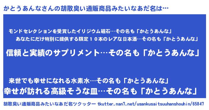 | 男性向けラノベタイトル風あだ名 | 『はたらくかとうあんなさま!』 |