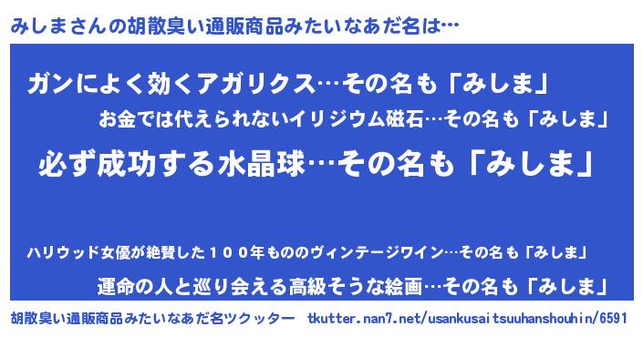 | 男性向けラノベタイトル風あだ名 | 『みしまの憂鬱』『魔法科高校のみしま』 |