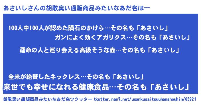 | ヒーロー風カッコイイあだ名 | 『ウルトラあさいしマン』『ネオアサイシ』 |