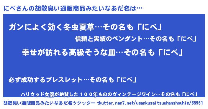| 女子向けラノベタイトル風あだ名 | 『にべの雑貨屋さん』『にべは平凡を望む』 |