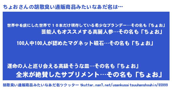 | 男性向けラノベタイトル風あだ名 | 『おまえをオタクにしてやるから、俺をちょおにしてくれ! 』 |