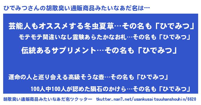 | 男性向けラノベタイトル風あだ名 | 『ダンジョンにひでみつを求めるのは間違っているだろうか』 |
