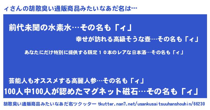 | 意味不明あだ名 | 『住所不定無職ィ(47歳)』『永久保存ィ』 |