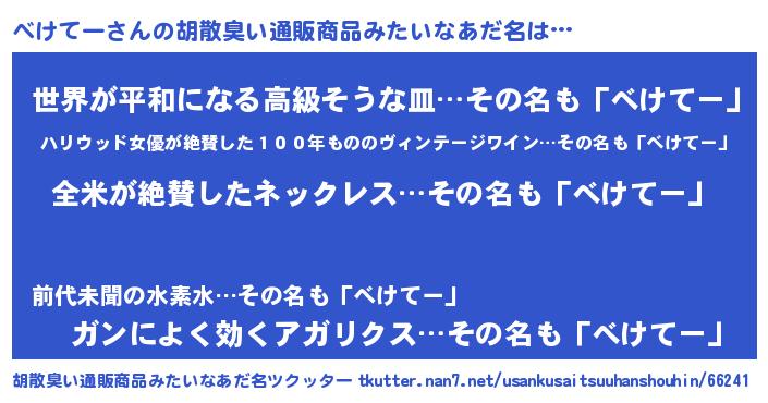 | 男性向けラノベタイトル風あだ名 | 『べけてー~年齢イコール彼女いない歴の魔法使い~』 |