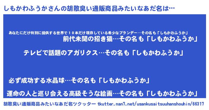 | ヘコむあだ名 | 『なまこ酢』『しもかわふうか(爆)』 |