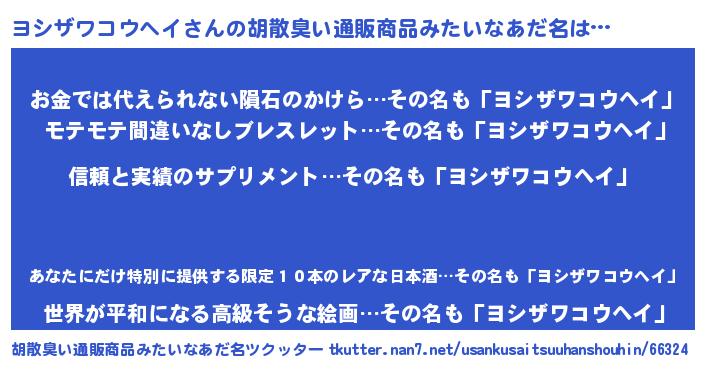 | 欧米人風あだ名 | 『ウサインヨシザワコウヘイ』 |