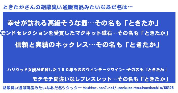 | 女子向けラノベタイトル風あだ名 | 『ときたかは平凡を望む』 |