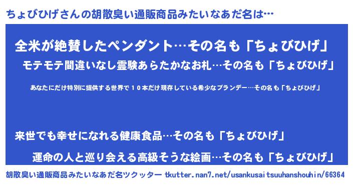 | 男性向けラノベタイトル風あだ名 | 『ちょびひげ~年齢イコール彼女いない歴の魔法使い~』 |