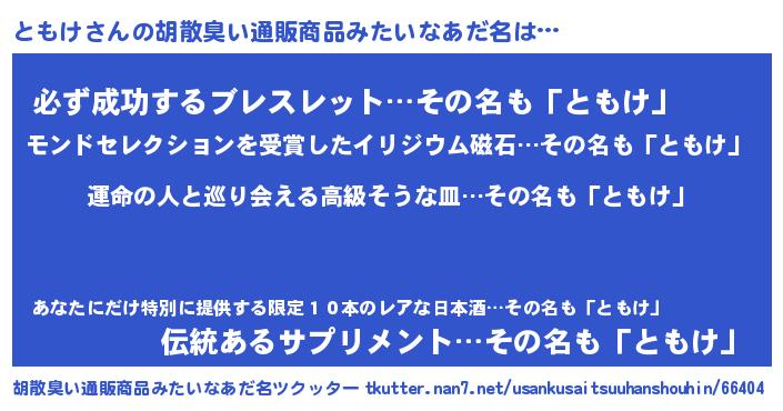 | 男性向けラノベタイトル風あだ名 | 『ともけに滅ぼされるだけの簡単なお仕事です』 |
