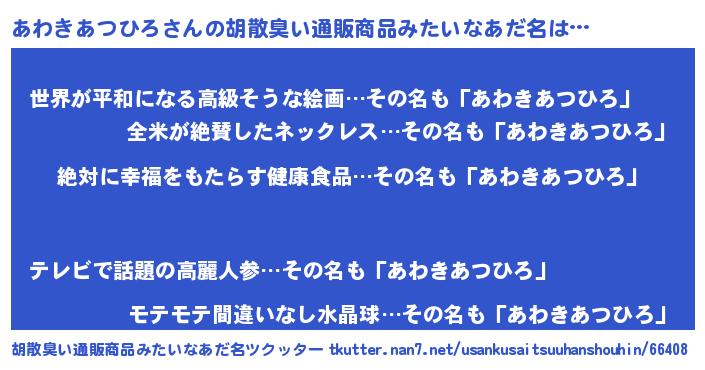 あわきあつひろさんの胡散臭い通販商品みたいなあだ名をツクッター!