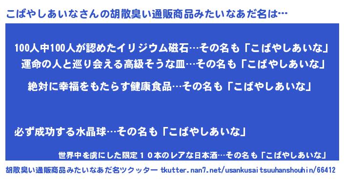 | ヒーロー風カッコイイあだ名 | 『ネオコバヤシアイナ』『仮面コバダー』 |
