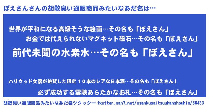 | ヘコむあだ名 | 『ぼえさん(震え声)』『なまこ酢』 |