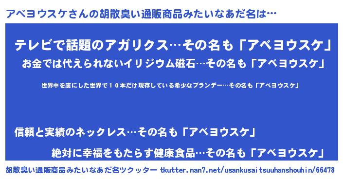 | 意味不明あだ名 | 『住所不定無職アベヨウスケ(93歳)』 |