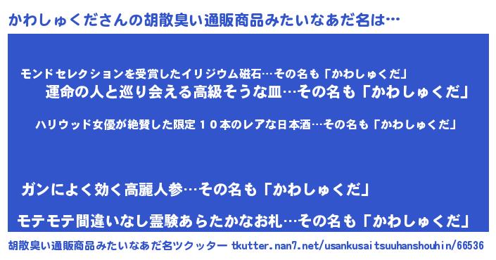 | 意味不明あだ名 | 『住所不定無職かわしゅくだ(39歳)』 |