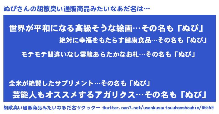 | 男性向けラノベタイトル風あだ名 | 『ぬぴの憂鬱』『はたらくぬぴさま!』 |