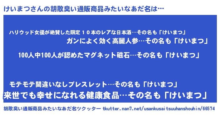 | 男性向けラノベタイトル風あだ名 | 『おまえをオタクにしてやるから、俺をけいまつにしてくれ! 』 |