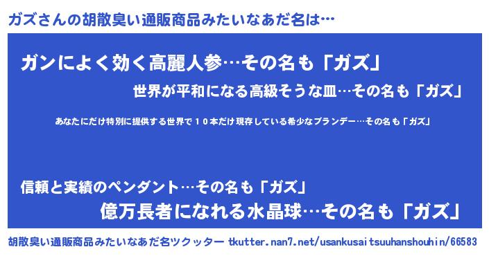 | 男性向けラノベタイトル風あだ名 | 『この素晴らしい世界にガズを!』 |