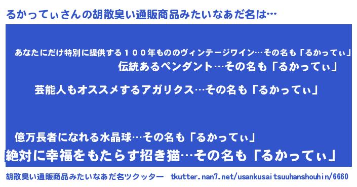| 男性向けラノベタイトル風あだ名 | 『Re:るかってぃから始める異世界生活』 |