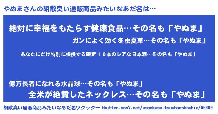 | 男性向けラノベタイトル風あだ名 | 『この素晴らしい世界にやぬまを!』 |
