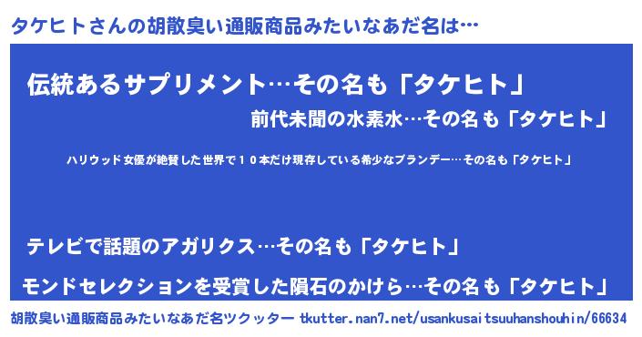 ヘコむあだ名 | 『タケぷりん』『タケヒト(爆)』 |
