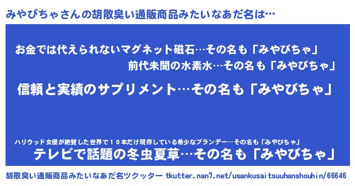 | ヘコむあだ名 | 『みや太郎』『みやびちゃ(笑)』 |