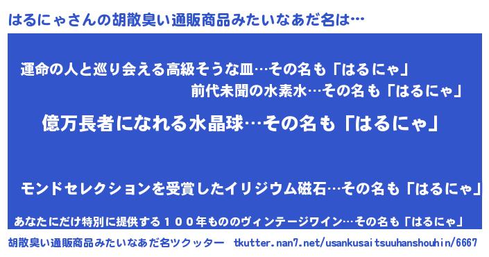 | 男性向けラノベタイトル風あだ名 | 『ハルニャアートオンライン』 |