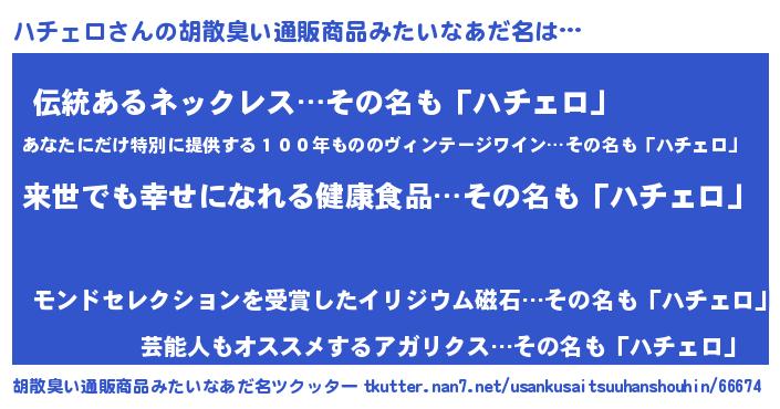 | ヒーロー風カッコイイあだ名 | 『ネオハチェロ』『魔戒騎士ハチ』 |