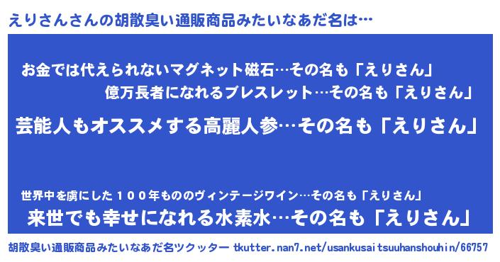 | ヒーロー風カッコイイあだ名 | 『究極戦士エリサン』『愛の使者えりさん』 |