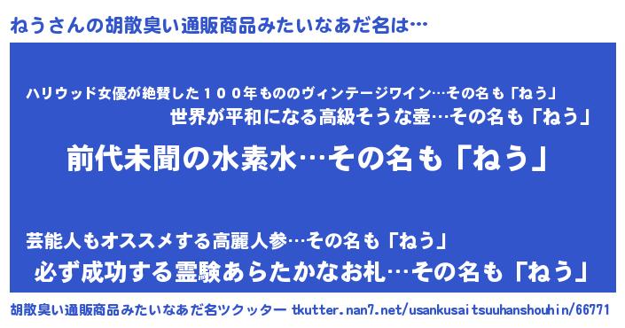 | ヘコむあだ名 | 『ねう(遠い目)』『ねうにー』 |