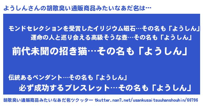 | ヘコむあだ名 | 『ようしん(笑)』『ようにゅー』 |
