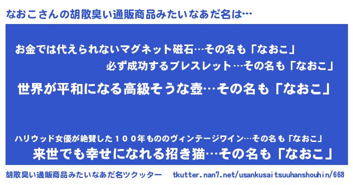 | ヘコむあだ名 | 『豆乳』『なおこ(小並感)』『なおお』 |