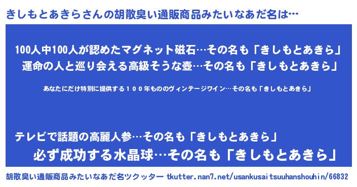 | 意味不明あだ名 | 『住所不定無職きしもとあきら(6歳)』 |