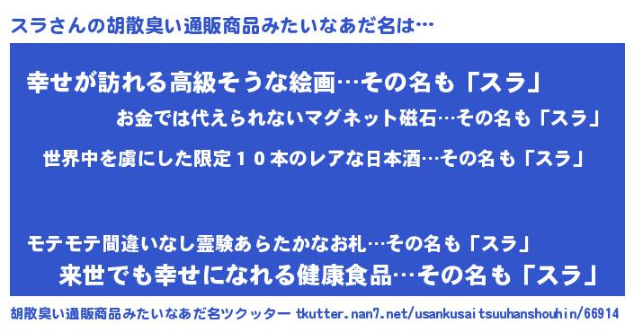 | 意味不明あだ名 | 『住所不定無職スラ(53歳)』『永久保存スラ』 |