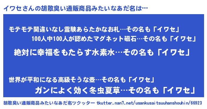 | ヘコむあだ名 | 『イワセ(苦笑)』『イワもー』『牛乳』 |