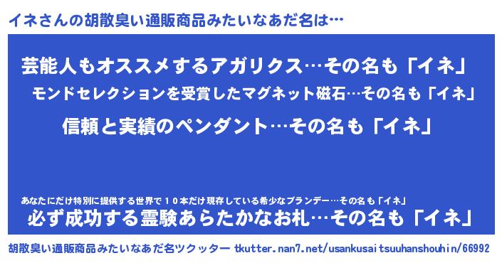| 意味不明あだ名 | 『とにかく怪しいイネ』『自称イネ』 |